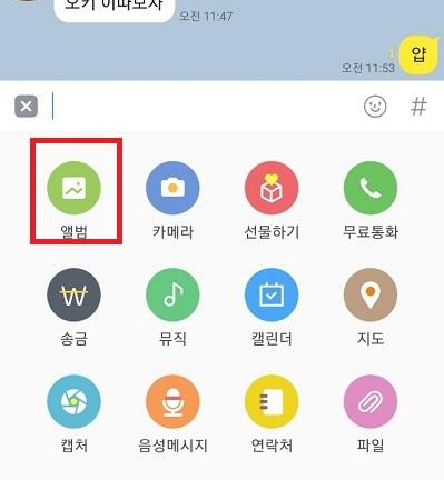 채팅방 하단에 '+'마크를 클릭하여 사진 전송