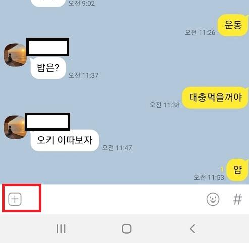 보통 카톡으로 사진을 전송할 때의 방식은 다들 잘 알고 계실꺼라 생각하지만 그냥 처음부터 하나하나 포스팅하는게 나을것 같네요. 먼저 사진을 보낼 상대방과 채팅을 하고 채팅방 하단에 '+'마크(위 사진의 빨간색 네모)를 클릭하여 앨범을 선택하도록 합니다.