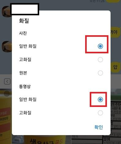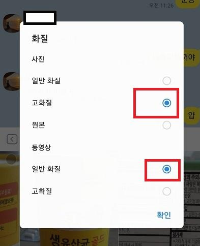 이제 사진의 화질을 고화질로 변경하고 하단의 확인을 누르면 끝입니다. 이렇게 카카오톡 사진 전송 모드 옵션을 변경한 후에 사진을 전송하면 고화질의 사진이 전송되게 됩니다.
